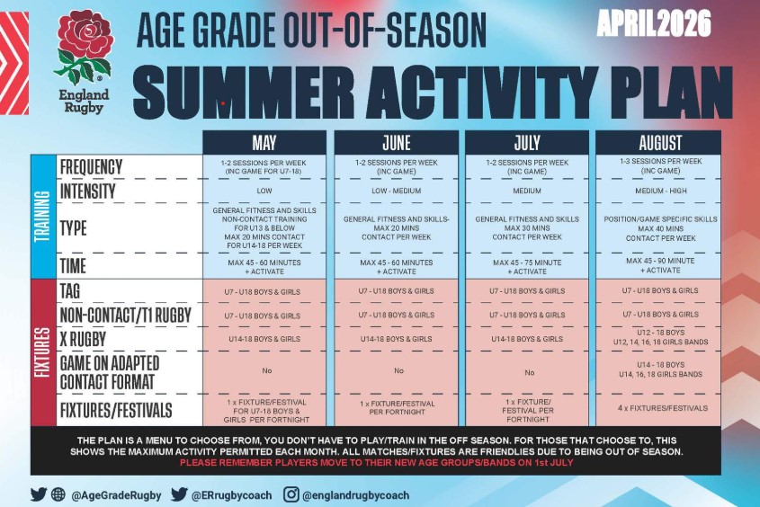 Please see Below the Summer Activity Plan for this summer.  This provides the maximum activity permitted in the off season months from May to August within the regulations of the age grade game.